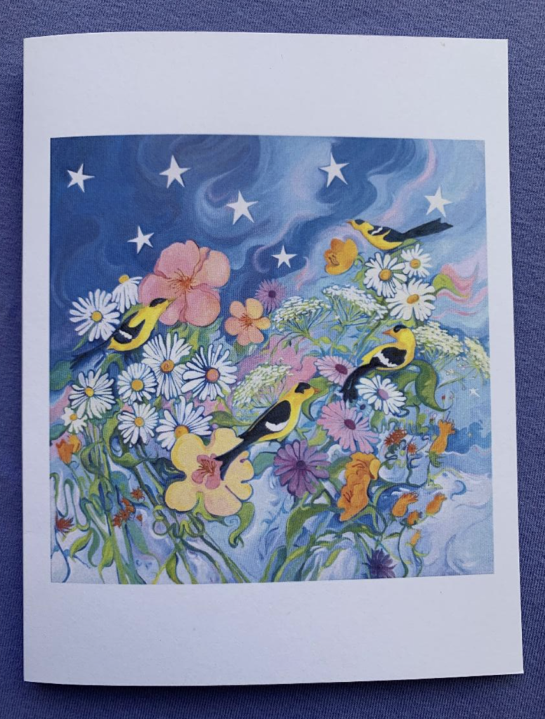 A twilight sky with 7 sister stars shines over a meadow filled with marguerites, Cherokee roses and gold finches. A tiny new star is nestled in Queen Anne’s Lace.